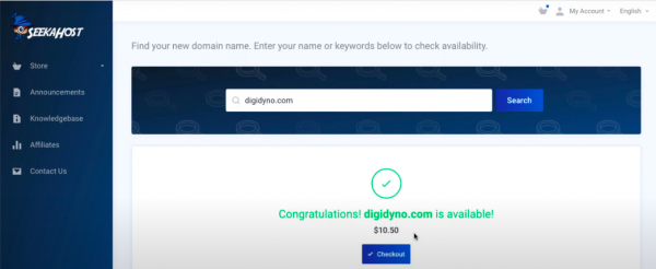 So, first things first, you need to register a new domain name. You will see a search box to enter a domain name. Just type in a domain name, and click on search.