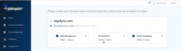 After you click on checkout, you can select the add ons like free DNS management, and email forwarding option for free.