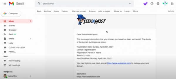 Check your email inbox where you will receive an email confirming the domain registration to be successful.